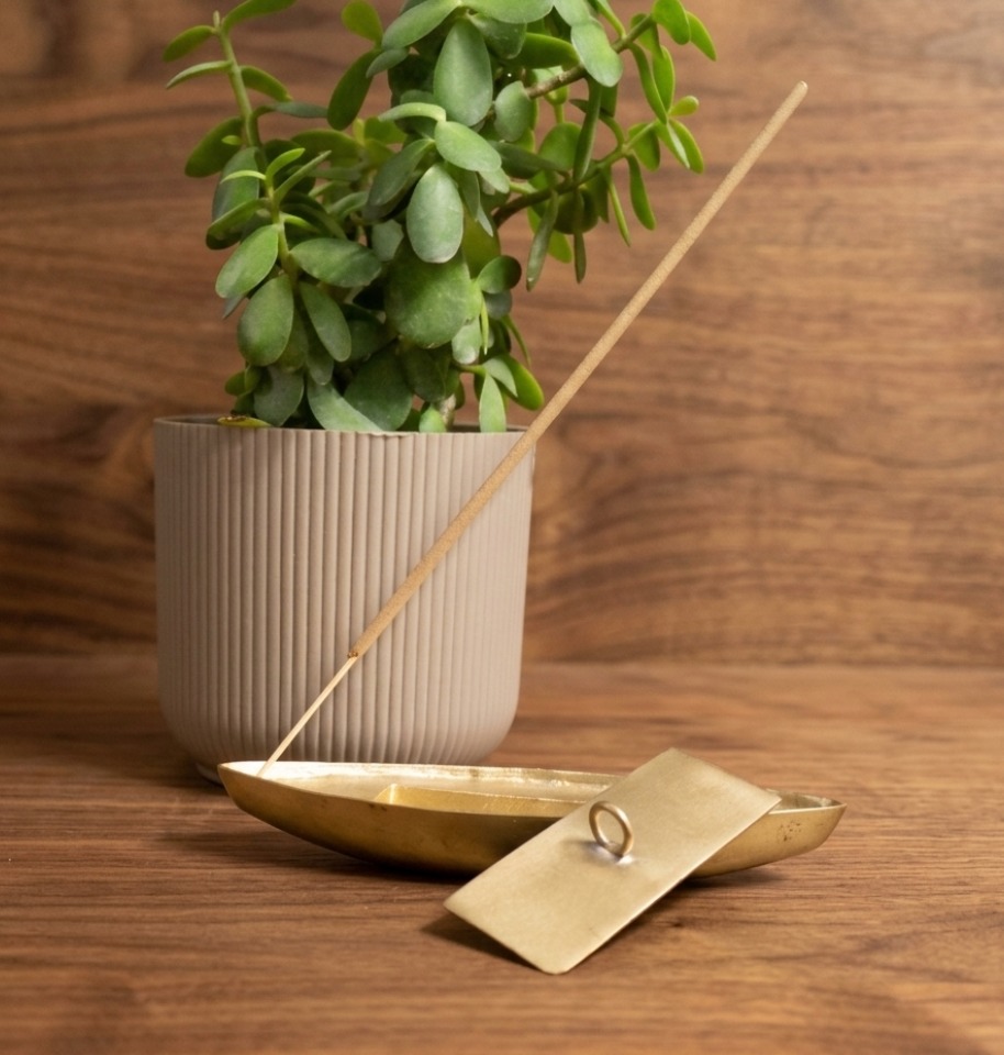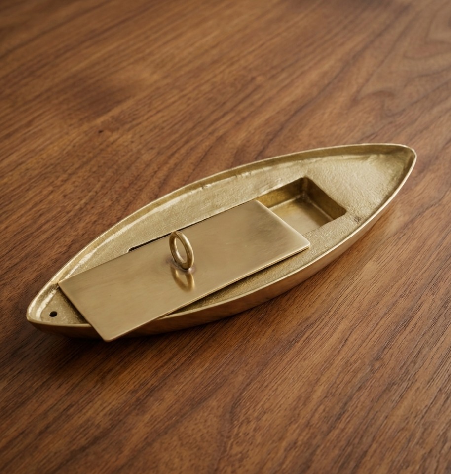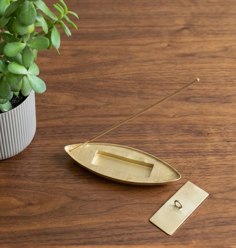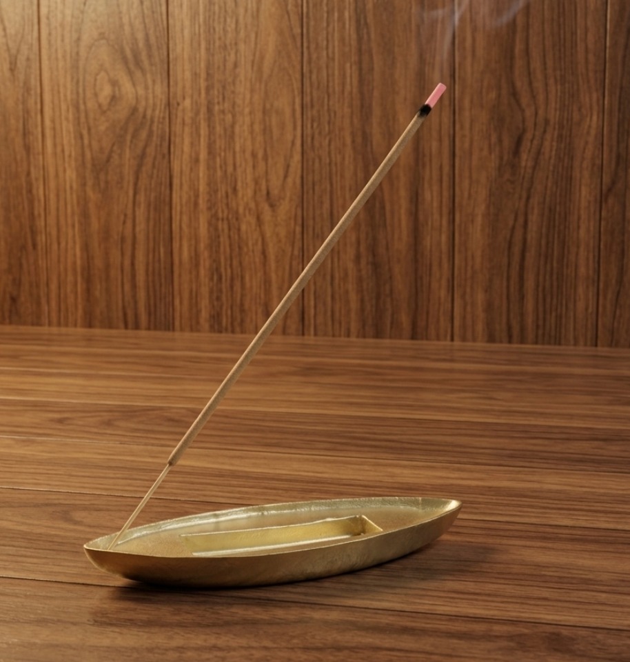 Elegant boat-shaped brass incense holder designed to hold incense stick securely while collecting ash neatly, adding a traditional and decorative touch to your space.