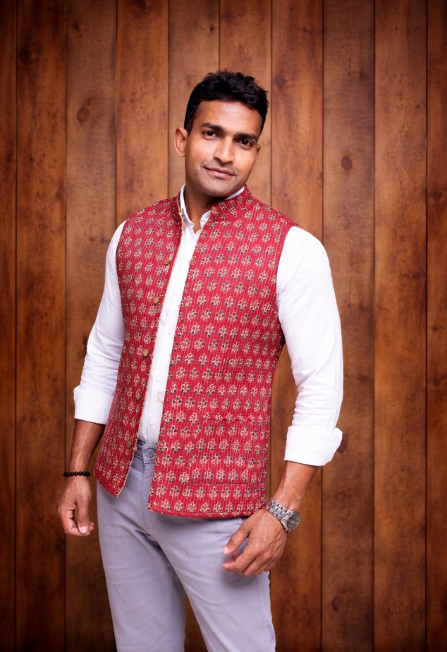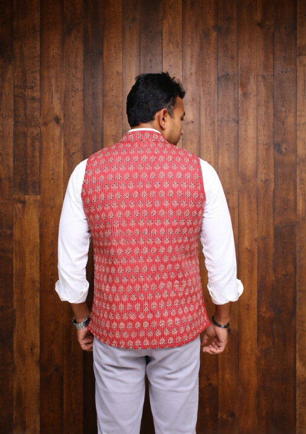 This handcrafted reversible quilted jacket combines comfort with elegance. The front side features a textured quilted design in solid red with handy front pockets, while the reverse side showcases a printed cotton fabric with ethnic patterns. Soft, breathable, and lightweight, it is a must-have addition to your winter wardrobe.