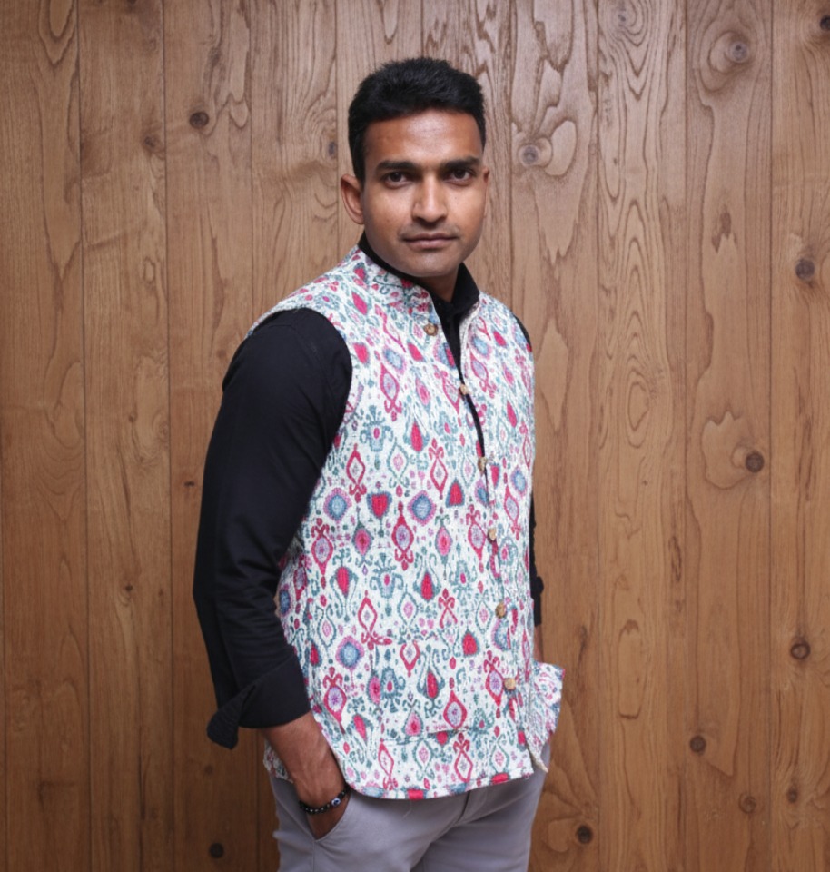 This handcrafted reversible quilted jacket combines comfort with elegance. The front side features a textured quilted design in solid red with handy front pockets, while the reverse side showcases a printed cotton fabric with ethnic patterns. Soft, breathable, and lightweight, it is a must-have addition to your winter wardrobe.